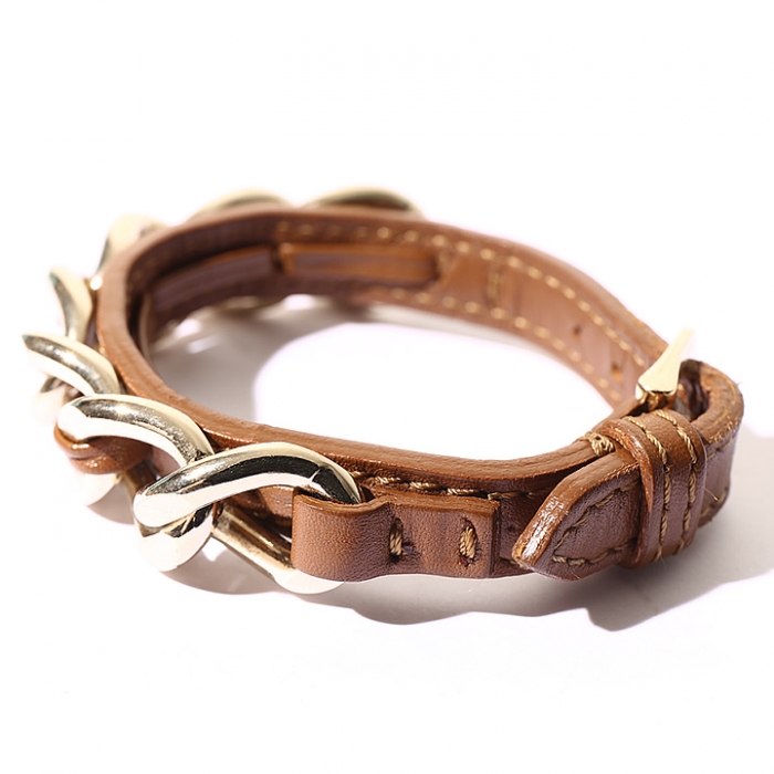 大人カジュアルなレザーバングルが人気ランキング一位に輝きました。厚みのあるレザーにゴールドトーンのチェーンが付いた存在感のあるバングルです。使えば使うほど馴染み、ブラウンのレザーの風合いが豊かになります。大切に育てていきたいレザーアクセサリーです。幅は細めなので、ハードにならずに品の良さも感じます。カジュアルな装いのアクセントに最適です。